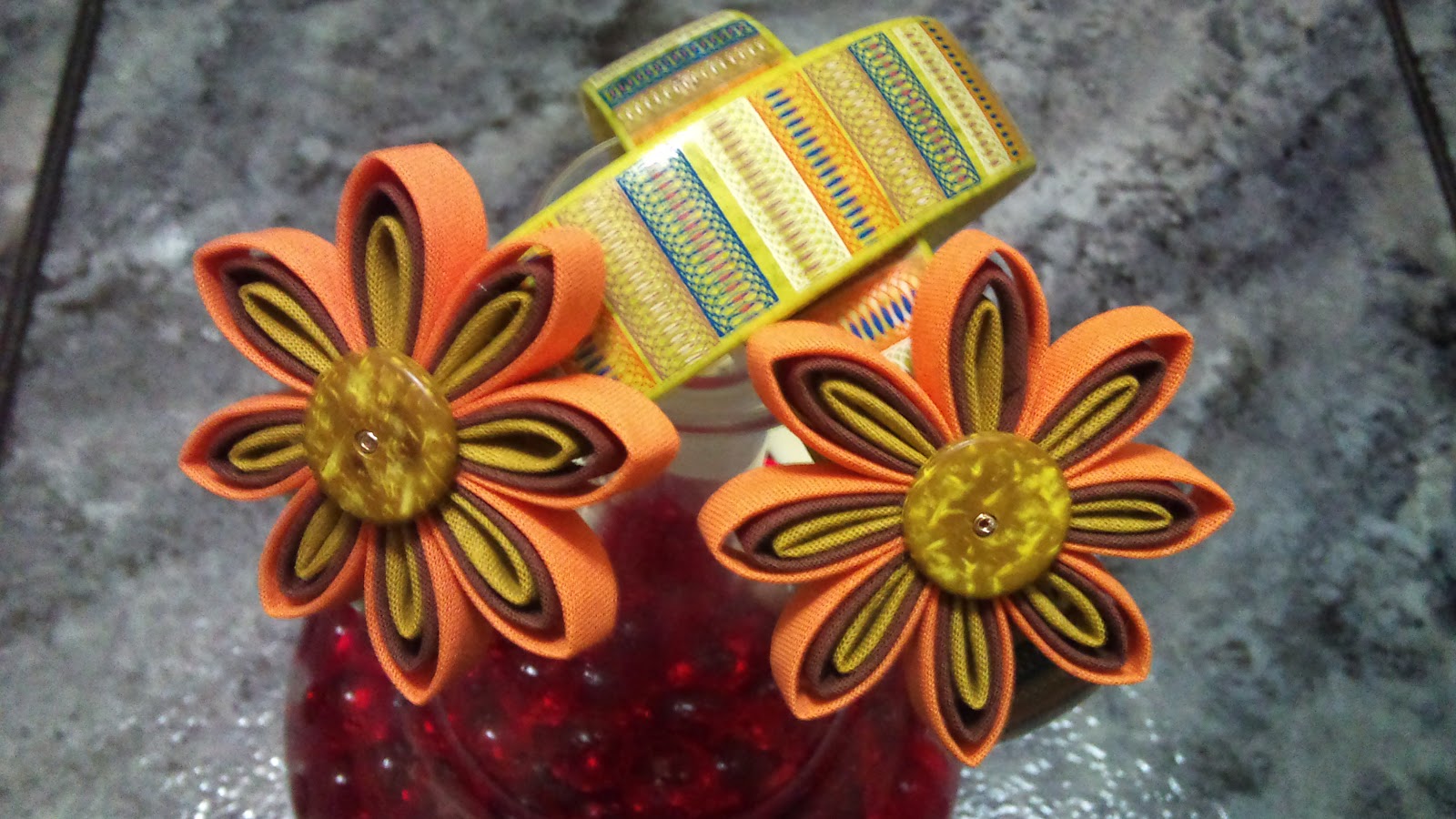 Diadema con dos rollos de cola de ratón en tonos naranja y blanco, con cuenta en el centro