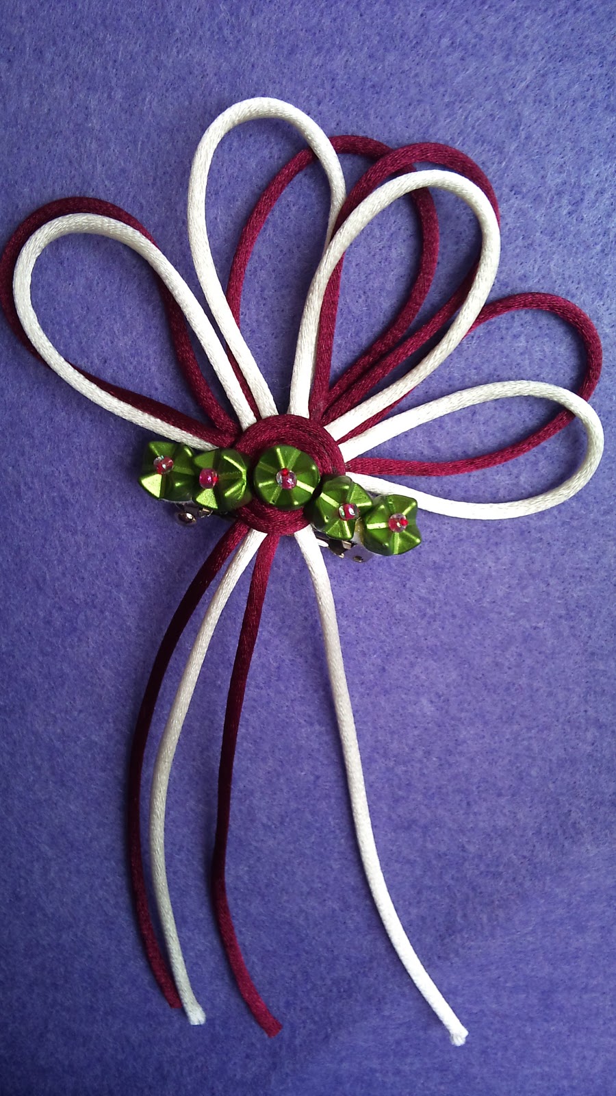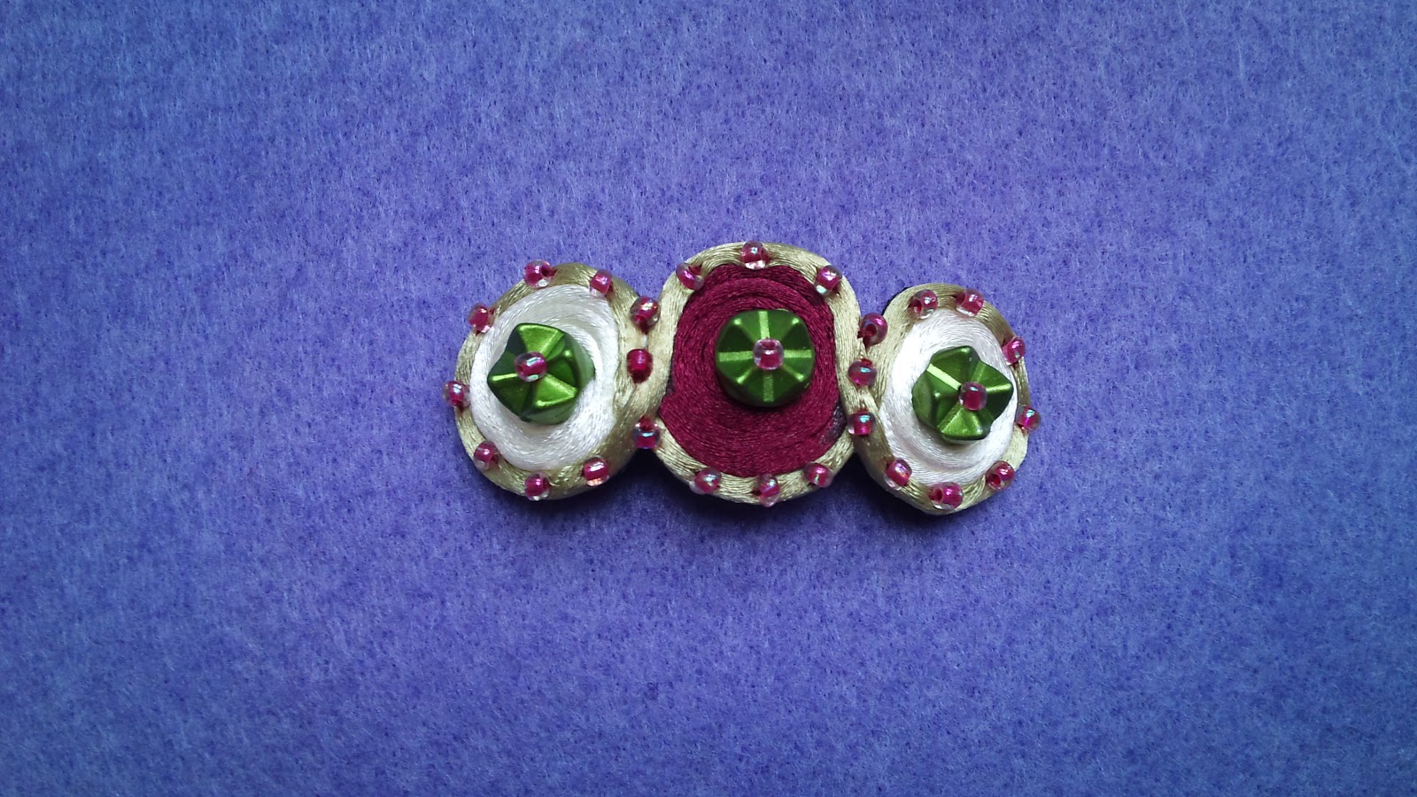Diadema con tres rollos de cordón en tonos rosa y morado, y con cuenta en el centro